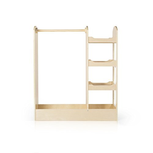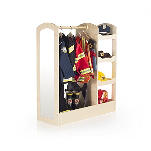 Features three storage shelves on one side for toys, shoes and dramatic play items; a deep bottom with sides; a sturdy wood dowel for hanging clothes and costumes; and an acrylic mirror for dramatic play. Birch construction with a smooth, natural finish. Accessories not included. Adult assembly required. Ages 3+. 36"W x 14"D x 42"H