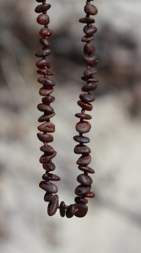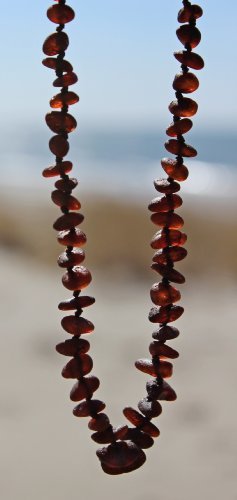 Baltic amber necklace Length of necklace is 13 inches (32-33 cm) ABOUT BALTIC AMBER TEETHING NECKLACE Dear mum and dad, amber teething jewelry is made for wearing not chewing. As with anything else children should be supervised at all times when wearing jewelry and it has to be removed whenever a child is sleeping or unattended! An amber teething necklace is made from Genuine Baltic amber, an organic substance-fossil resin that was produced under natural conditions at least 45 million years ago. The unique substance of amber has anti-inflammatory properties which can be absorbed when it is worn against the skin. Hence, teething necklaces which soothe a child naturally when he or she suffers from teething pain. The actual practice of making amber amulets for children and adults is ancient history. Traditionally, amulets were carved into various shapes and were worn to ward off evil spirits - or just plain bad luck. It's also a very strong possibility that because these amulets also reduced inflammation and discomfort for their wearers. Currently, there are two different thoughts as to why wearing amber on the skin can have soothing and calming effects on teething children. One thought suggests that when amber is worn on the skin, the skin's warmth releases miniscule amounts of healing oils from amber which are then absorbed through the skin into the bloodstream. The other theory is based on scientific findings which have shown that amber is electromagnetically alive and produces significant amounts of organic, purely natural energy.