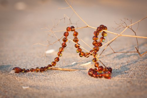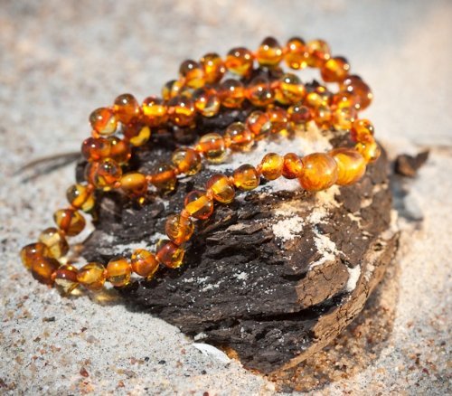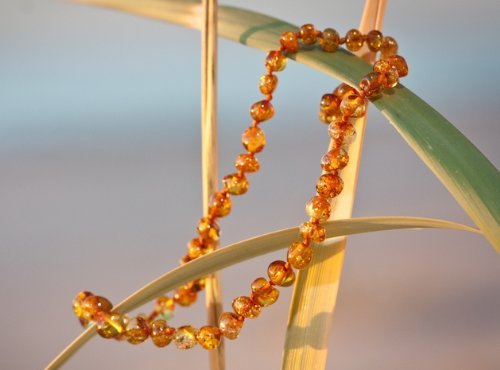 Baltic amber necklace Length of necklace is 13 inches (32-33 cm) ABOUT BALTIC AMBER TEETHING NECKLACE Dear mum and dad, amber teething jewelry is made for wearing not chewing. As with anything else children should be supervised at all times when wearing jewelry and it has to be removed whenever a child is sleeping or unattended! An amber teething necklace is made from Genuine Baltic amber, an organic substance-fossil resin that was produced under natural conditions at least 45 million years ago. The unique substance of amber has anti-inflammatory properties which can be absorbed when it is worn against the skin. Hence, teething necklaces which soothe a child naturally when he or she suffers from teething pain. The actual practice of making amber amulets for children and adults is ancient history. Traditionally, amulets were carved into various shapes and were worn to ward off evil spirits - or just plain bad luck. It's also a very strong possibility that because these amulets also reduced inflammation and discomfort for their wearers. Currently, there are two different thoughts as to why wearing amber on the skin can have soothing and calming effects on teething children. One thought suggests that when amber is worn on the skin, the skin's warmth releases miniscule amounts of healing oils from amber which are then absorbed through the skin into the bloodstream. The other theory is based on scientific findings which have shown that amber is electromagnetically alive and produces significant amounts of organic, purely natural energy.