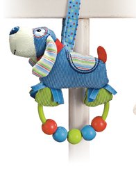 High quality surfuce washable fabric baby boy beaded rattle.;Ideal for hanging from the crib. It comes with velcro attachmment for crib.;This is a 5.5 beaded rattle in the shape of a dog.;Embroided details, and it comes with touch tags on the legs.