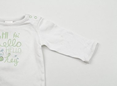実際のサイズ表記は6-12mosです。左袖に黄色いシミあり。カメの刺?が可愛らしいデザインです。