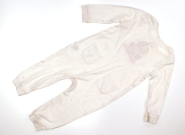 - 脚部分にスナップボタンがある被って着るタイプのカバーオールです。前身ごろ脚部分に薄くシミが見受けられますが、まだまだお使いいただけそうです。
