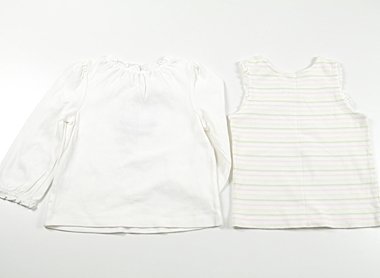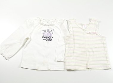 実際のサイズ表記は3Tです。どちらも前中心に広範囲でシミがあります。お得な2枚セットです。洗い替えにいかがでしょうか?