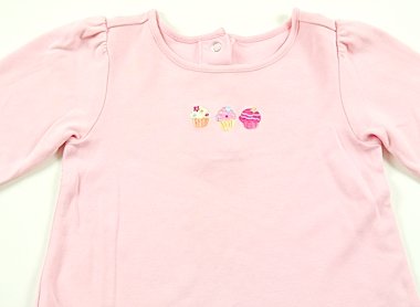 実際のサイズ表記は18-24monthsです。とても手触りの良い上質なカットソー。前身頃に広範囲でうっすら黄ばみがあります。普段着としていかがでしょうか。カップケーキの刺繍がとってもキュート!(記名あり)