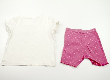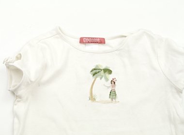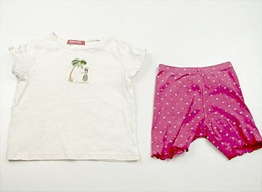 - 半袖Tシャツは前身ごろ全体に複数しみがあります。刺繍の状態は良好です。手触りの良いカットソーなので洗い替えにいかがでしょうか。おまけで同ブランドのショートレギンス(ブランドタグに記名あり。色褪せあり)つき。(記名あり)