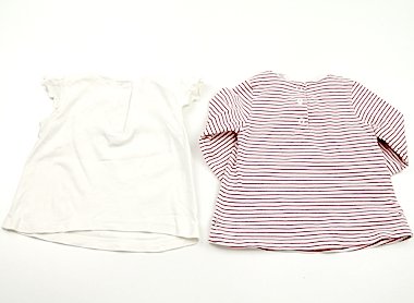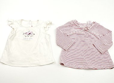 実際のサイズ表記は18-24monthsです。衿元や袖口に変色があります。普段着としていかがでしょう。おまけで同ブランドの鳥さんアップリケカットソー(アップリケまわりに変色があります)つき。(記名あり)