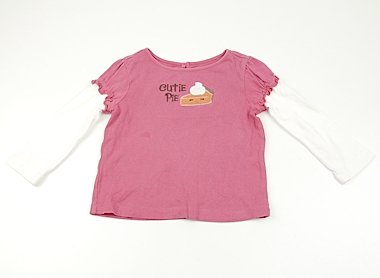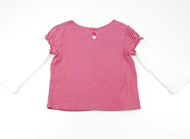実際のサイズ表記は18-24mosです。前身頃中央あたりに油のような透明のシミあり。色褪せヨレ感あり。外遊びや洗い替え用にいかがでしょうか?重ね着風ですが2重にはなっていません。