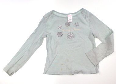 スノーフレークのラインストーンが可愛らしいデザインです。お袖や裾部分にシミが点在していますがまだまだ普段着として活躍してくれそうです。実際のサイズ表記は6です。