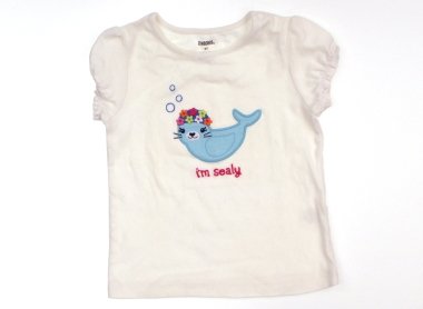 実際のサイズ表記は2Tです。左脇あたりに黄色い汚れがありますが、アザラシが可愛らしいtシャツです。