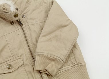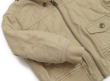 実際のサイズ表記は3です。裏キルティングで暖かなブルゾン。両袖に汚れがあり、裾に黒ずみもありますが外遊びや洗い替え用にいかがでしょうか?フェイクファー衿ははずせます。