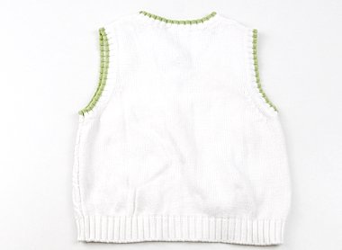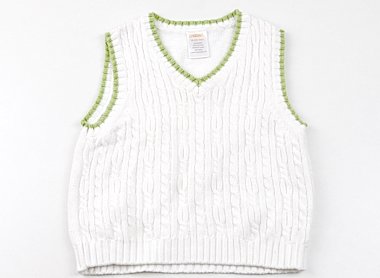 - コットンケーブルニットベスト。前中心に10cmほどの範囲で薄い黄ばみあり。型崩れは少なく、工夫次第でまだまだ活躍してくれそうです。実際のサイズ表記は18-24monthsです。