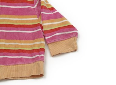 実際のサイズ表記は12-18monthsです。パイルベロア生地。オレンジのリブに毛玉があり、袖口に点々とシミがあります。ボーダー部分はきれいでまだまだ活躍してくれそうです。