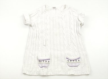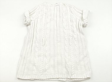 実際のサイズ表記はS(5-6)です。ざっくりした厚手コットンニットです。編地が詰まって硬くなっており、胸とお腹のあたりに広範囲で薄いしみがあります。普段着としていかがでしょう。ベルト通しありますがベルト欠損と思われますのでお安くしました。