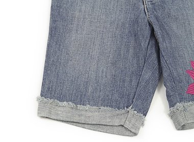 実際のサイズ表記は7です。薄めのデニム。サイズ調整ゴムが付いています。右ひざに赤っぽい汚れがあり、全体にユーズド感はありますが刺繍がとても凝っていて可愛いお品。まだまだ活躍してくれそうです。