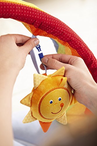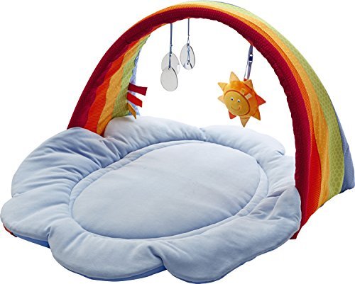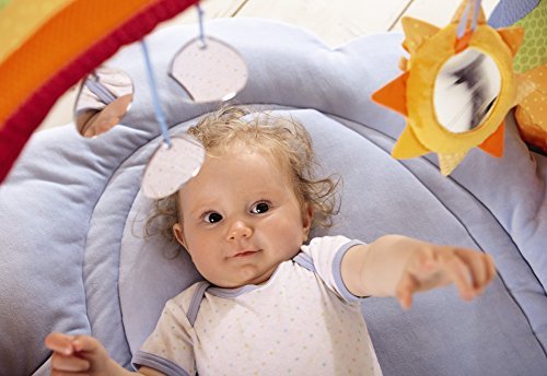 On the softly padded blanket; babies lie as if floating on clouds. The rainbow is an invitation to play. The removable sun; with its crinkling foil rays; rattles. One side of the sun shows a smiling face; the other has a mirror for the babies to look at themselves. The three raindrops also have safe; mirror effects and sparkle nicely when hit by the sun.