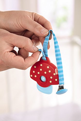 This practical toy from Haba can be clipped right onto baby's shirt for teething, or hook and loop over a stroller, crib or car seat for a dangling clutching toy. The mushroom is detachable.;It's filled with water and when refrigerated provides a cool, textured toy for little ones to gnaw, chew on and discover. Suitable for ages 6 months and up.;Haba's silicone teething toys are ideal for babies to place them in their mouths and suck on them. The knobs and surface textures feel different and help with relaxation.;Made from food-grade silicone, this teether is BPA and phthalate free. It can be refrigerated and is dishwasher safe.