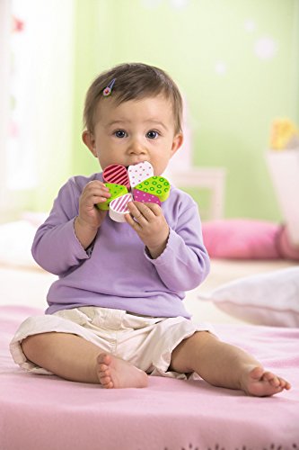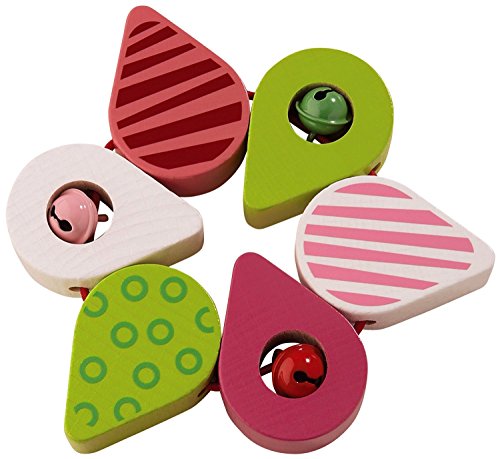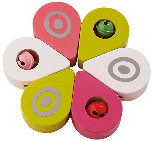 パーツをねじると花開くように形を変えるラトル。ミラーフォイルのプリントと鈴付き。ブナ製。