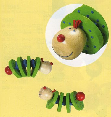ベビーの手の中でゆかいな音をたてるいもむしのラトル。丈夫なゴムでつながっています。