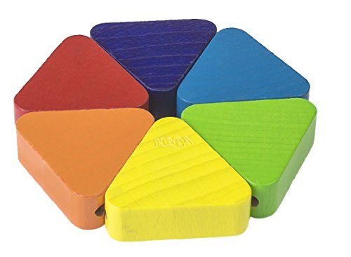 Wood is colored with a water based, non-toxic stain.; Baby toys recommended for ages 6 months and up; Moveable pieces held together by elastic allowing the creation of various shapes including a hexagon, star and paramid; Perfect rattle for teething babies; Wood is colored with a water based, non-toxic stain. Made in Germany;