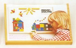 マグネット付のモザイクを貼り付けて絵や模様を作ります。木枠のボードは写真のように立てて使うことが出来ます。パターンシートを置いて、同じ形のモザイクを貼り付ければ易しく遊ぶことができ、シートにはビー玉転がしが出来るパターンも入っています。