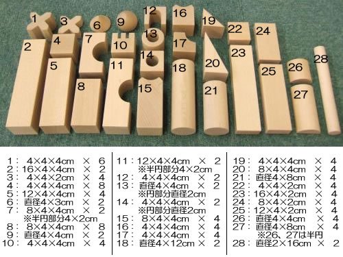 - 基本形と形に変化のある積木がセットされています。 収納に便利な布袋付。