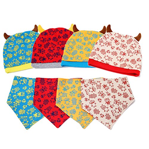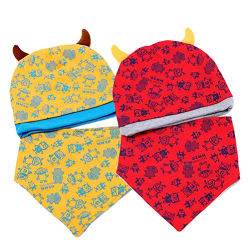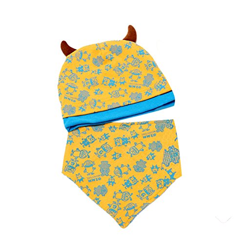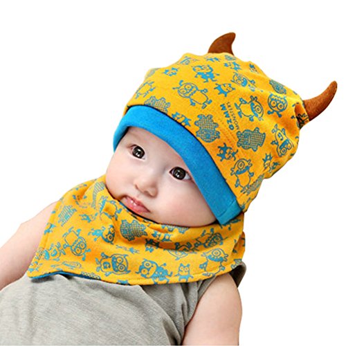 HBF ベビー 帽子 スタイ セット 角付き 綿制 吸湿 通気 モンスター 柄 かわいい キッズ 出産祝い ギフト プレゼント イエロー