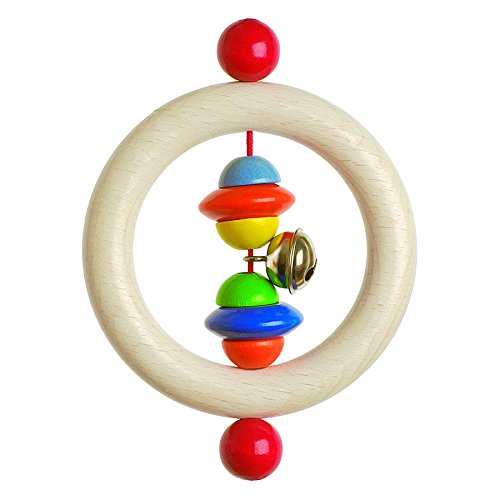 天然木を使ったビーズや、ディスク型のおもちゃが赤ちゃんを夢中にさせます。リングを振ると鈴の音が鳴ります。