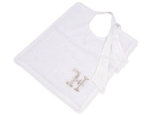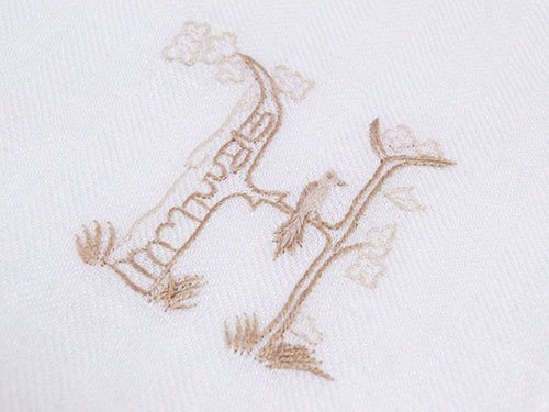 - ・Hモチーフと小鳥の刺繍がポイント・表は麻のヘリンボーン柄、裏側はタオル地になっています。・カラー:BLANC ANGE(表:ホワイト)xホワイト(裏)、刺繍:ベージュ・サイズ:約ヨコ29cmxタテ34.5cm、リボン:35cm