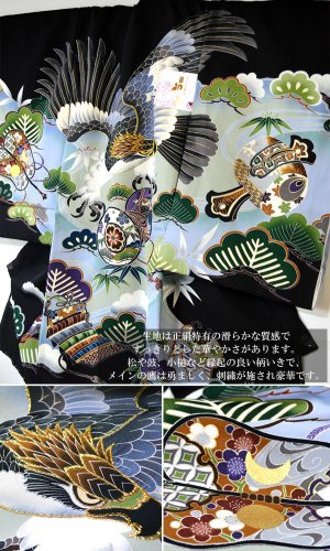 松や鼓、小槌など縁起の良い柄いきで、メインの鷹は勇ましく、刺繍が施され豪華です。