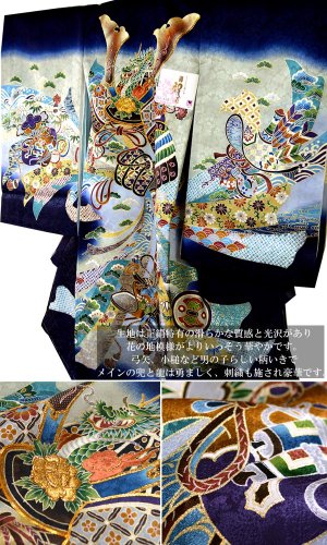 弓矢、小槌など男の子らしい柄いきでメインの兜と龍は勇ましく、刺繍も施され豪華です。
