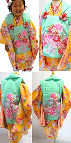 - ◆サイズ: 適合身長83cm~105cm 被布丈約48cm 裄丈約42cm 袖丈約57cm 着物丈約76cm 草履17.5cm(フリーサイズ) ※肩上げ、腰上げされてるので解いて数cm伸ばす(丈出し)ことも可能。 ※身長87cm~96cmのお子さんであれば丈直しは必要ありません。