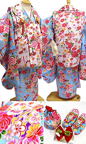 - ◆サイズ: 着物(丈上げ済)/身丈75cm 袖丈57cm 裄39cm 被布/身丈48cm 草履/18cm 巾着/高さ約11.5cm 底直径約8.5cm 髪飾り/約10cm