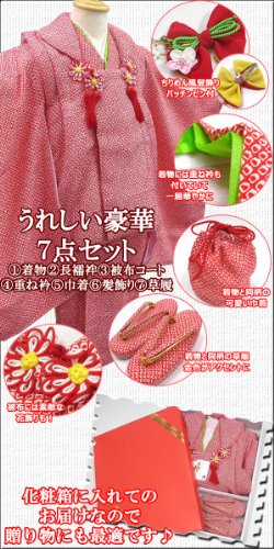 - ◆内容: 三歳用着物(重ね衿付)・長襦袢・被布・草履・巾着・髪飾り