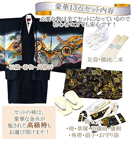 - ◆内容: 羽織、着物、長襦袢、羽織紐、角帯、袴、草履、懐剣、扇子、お守り袋、足袋(17-18cmおススメ)、腰紐2本。 (半衿・かかと止め・肌着等、また紋入れ加工は別購入の為、ご希望の方は同時購入して下さい。) 紋をご希望の場合、紋の種類・個数をお決め頂き同時購入して頂き、備考かメールで紋名をお知らせ下さい。(有料) *貼紋は70種類以外の場合、別注追加料金、納期15日間。 *刷込紋は納期20日間。