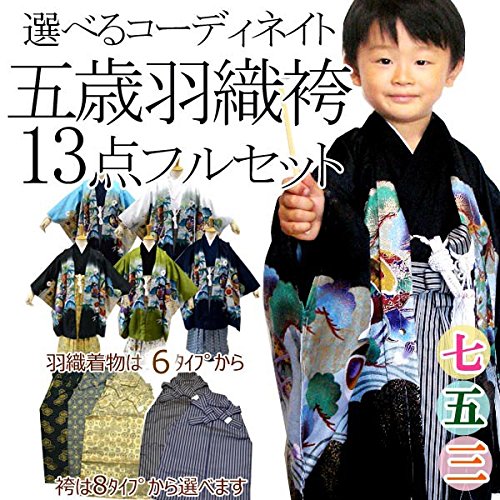 七五三 5歳 5才 男児 トータル13点フルセット 男の子 着物 紋付羽織袴 紋付袴 10タイプ/13(兜に巻物・白)