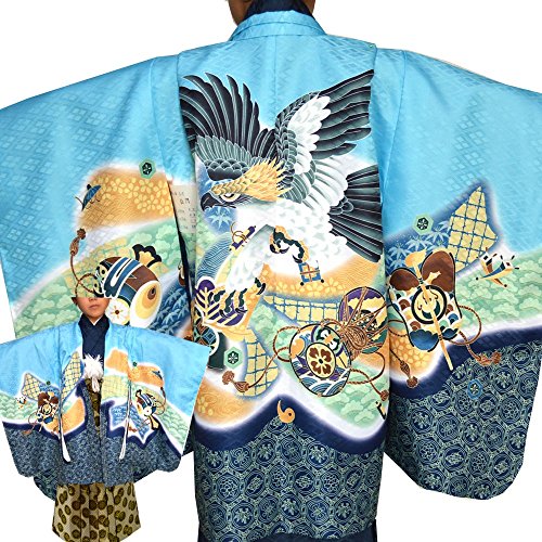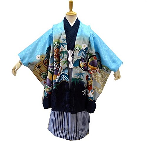 七五三 5歳 5才 男児 トータル13点フルセット 男の子 着物 紋付羽織袴 紋付袴 10タイプ/14(兜に巻物・水色)