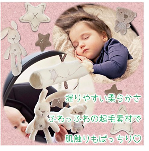 - ベッドでのモービルとして以外にも、ストローラーやベビーカーに取り付けて、赤ちゃんと一緒に楽しくおでかけもできます。 動くたびに揺れる人形を目で追ったり、触ったり、情緒を豊かに育みます。