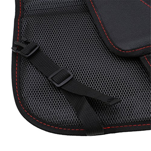 - 本体裏面の固定パッドをカーシート隙間に差し込み、あとはヘッドレストバーに、 調整可能ベルトをバックルで留めるだけ。 裏面は滑り止め加工をしているのでカーシート上で、ずれにくいです。