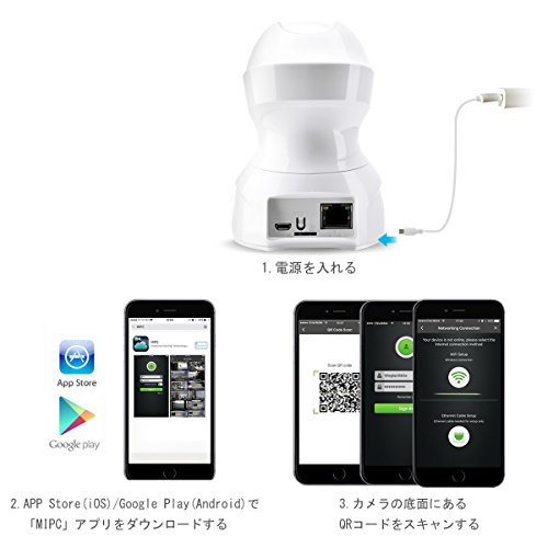 - 簡単に繋がる: QRコードをスキャンし或いはAppStoreやGooglePlayで「MIPC」を検索、アプリをダウンロードすることで、WIFI設定を始めます。 横振り350°、立て振り120°可能で、見たい場所をしっかり確認できます。