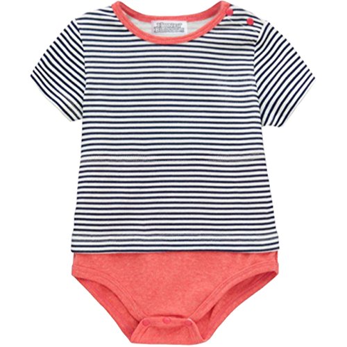 - ボーダーTシャツ × パンツ 風、シンプル可愛いデザインが素敵な、Tシャツ風ロンパースです。シャツ部分がレイヤードになっているので、お部屋着にはこれ一枚で、お出掛けにはボトムスとのコーディネートで、可愛く着こなせます。シャツがずり上がってお腹が出てしまうことが無いので、抱っこ時期の赤ちゃん、寝返りや這い這い時期の活動的な赤ちゃんにもお薦めです。 伸縮性のある柔らか素材。お揃いのモンキーパンツ(ヒップにボーダー柄♪) もご紹介中です。