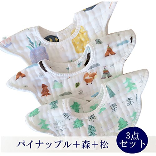 HORARA 8重カーぜ 綿100% ベビー ビブ よだれかけ 花びら型 (パイナップル/森/松、3点セット)