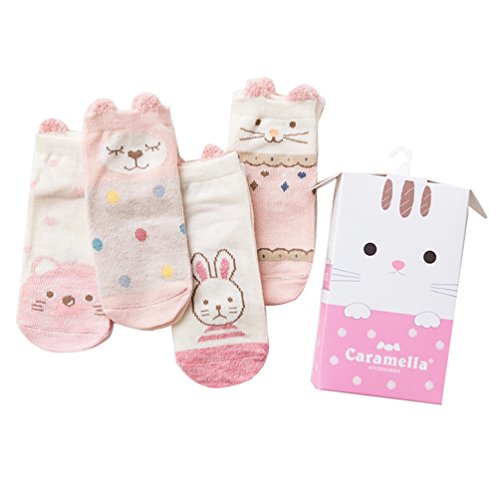 HORARA 子供 ソックス キッズ 靴下 綿100% スニーカーソックス かわいい 動物柄 吸湿速乾 抗菌 防臭加工(ネコ柄 4足 セット、S(1~3歳))