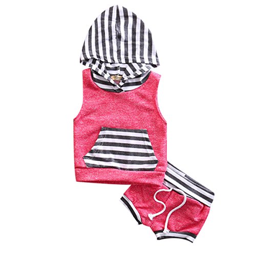 0-4歳 新生児 幼児 女の子 男の子 子供服 縞模様 ノースリーブ シャツ+ ストライプ プリント ショートパンツ 上下二点セット 夏 (ローズ, 110)