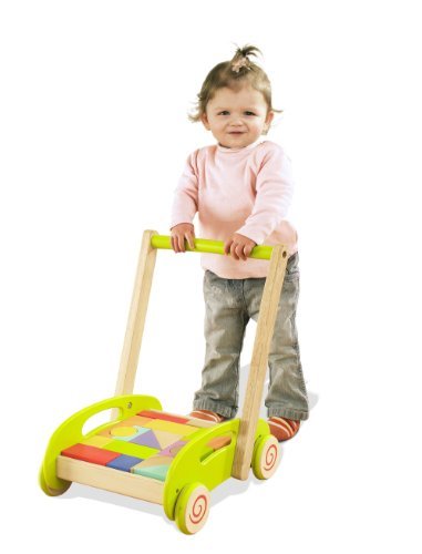 Shape sorting walker with wide base and set back wheels offers a stable base for early walkers. Includes a collection of 24 colorful and natural shapes to dump, stack and sort or empty and fill the cart again. Adult Assembly Required. Age: 1+. 13 in. x11.3 in. x 15.6 in..