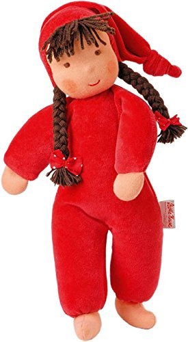 Waldorf Schatzi Red 2015 Doll by Kathe Kruse is a 14 inch tall soft body doll make of 100% organic materials. It is for newborns and up. The doll is machine washable on a gentle cycle. This is the new version of the doll for 2015. She is clothed in a red jumper and hat and has an embroidered face and pigtails.