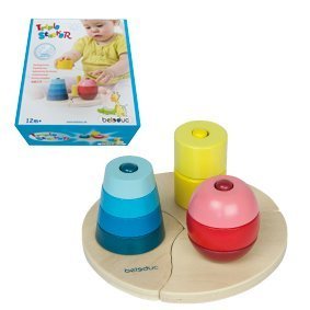 Stacking blocks is fun! Three colourful shapes are stacked and built on three poles. With the Triple Stacker the baby can practise holding blocks and stacking them. This promotes fine motor skills and hand-eye coordination. The big wooden blocks facilitate grasping.
