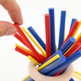 HABA、ハバ社のゲーム。「スティッキー(ZITTERNIX)」 とってもシンプルで、何度もやりたくなるスティッキー。 丸いリングにカラフルな棒を刺したらゲームスタート! サイコロを振り、出た色の棒を抜いていきます。 進めていくうちにバランスが崩れ始め、 崩れてリングが地面についてしまったらゲーム終了です。 それぞれ棒の太さが異なり、スリルがあって楽しめます。 簡単で明快なルールですので、年代を問わず遊べます。 設定は6歳からとなっておりますが、 スティックを慎重に抜く事ができる、5歳頃から遊べます。<and child>