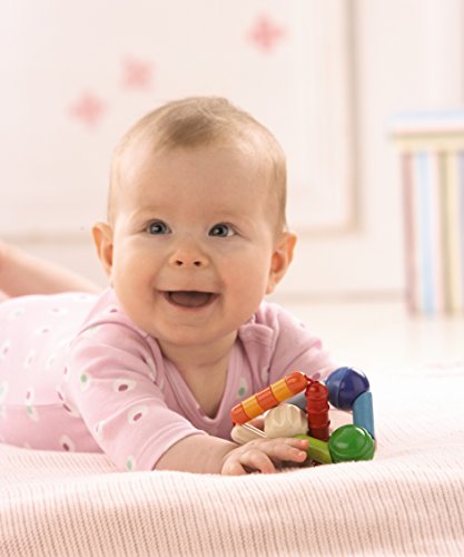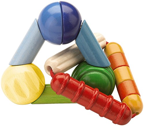 So many textures & colors to discover. Ask the child where is the orange part? A unique combination of different materials from wooden to plastic makes this clutching toy/rattle truly stimulate more than just the visual sense. The two triangles click, cla