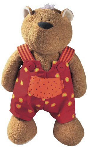 This stuffed teddy bear includes a pair of dungarees. Made of velours with an inner lining of polyester fleece and granulate.