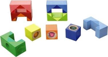黄色積木は木玉のラトル、オレンジ積木は不思議なプリズム、青色積木は